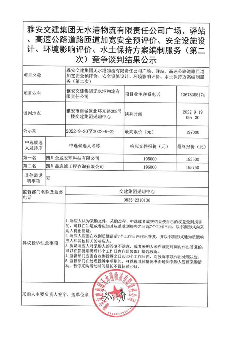 雅安交建集團(tuán)無水港物流有限責(zé)任公司廣場(chǎng)、驛站、高速公路道路匝道加寬安全預(yù)評(píng)價(jià)、安全設(shè)施設(shè)計(jì)、環(huán)境影響評(píng)價(jià)、水土保持方案編制服務(wù)(第二次)競(jìng)爭談判結(jié)果公示
