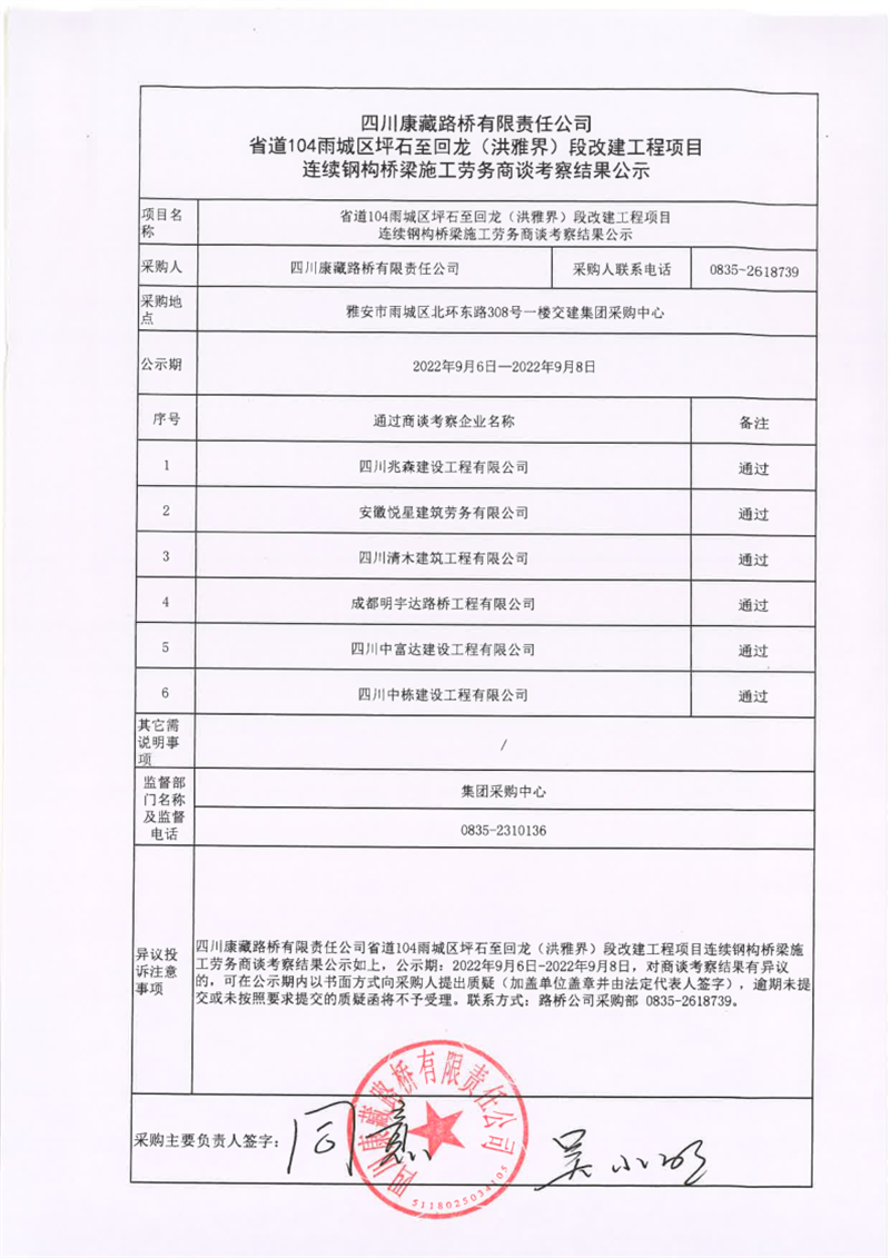 四川康藏路橋有限責(zé)任公司省道104雨城區(qū)坪石至回龍(洪雅界)段改建工程項(xiàng)目連續(xù)鋼構(gòu)橋梁施工勞務(wù)商談考察結(jié)果公示