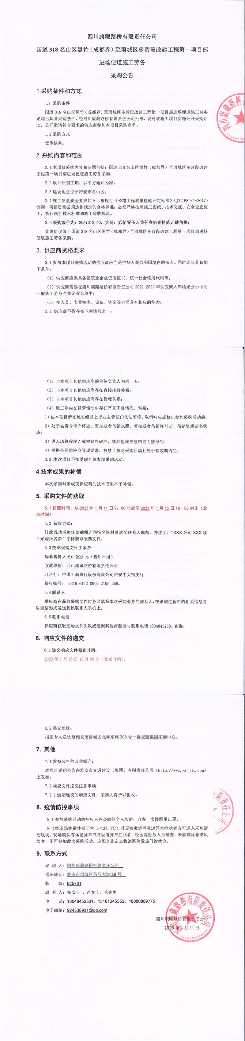 四川康藏路橋有限責(zé)任公司國道318名山區(qū)黑竹(成都界)至雨城區(qū)多營段改建工程第一項目部進場便道施工勞務(wù)采購公告