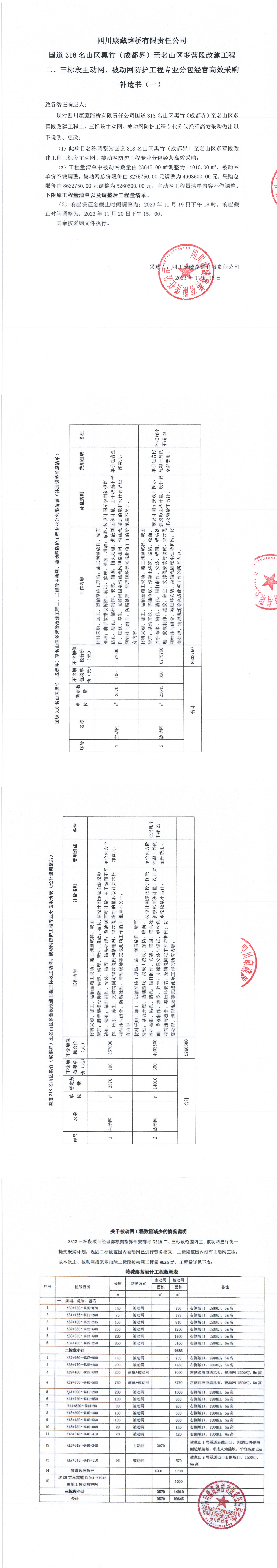 四川康藏路橋有限責(zé)任公司國(guó)道318名山區(qū)黑竹(成都界)至名山區(qū)多營(yíng)段改建工程二、三標(biāo)段主動(dòng)網(wǎng)、被動(dòng)網(wǎng)防護(hù)工程專(zhuān)業(yè)分包經(jīng)營(yíng)高效采購(gòu)補(bǔ)遺書(shū)(一)