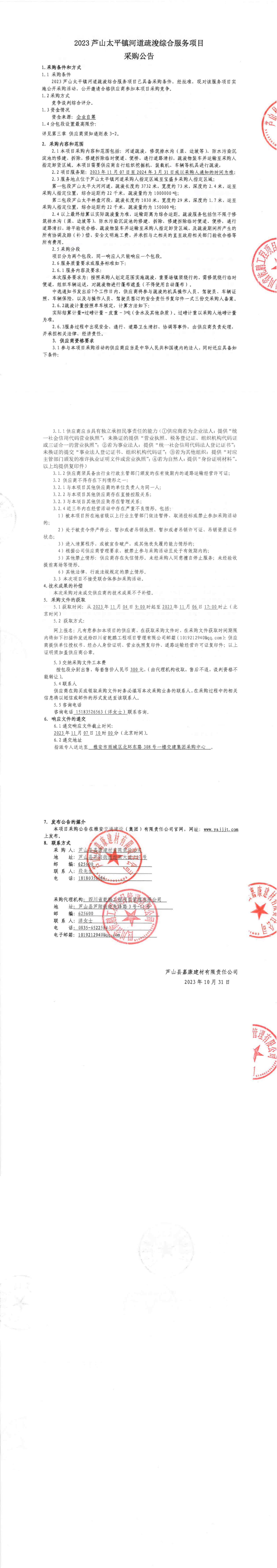 蘆山縣嘉康建材有限責(zé)任公司2023蘆山太平鎮(zhèn)河道疏浚綜合服務(wù)項(xiàng)目采購公告