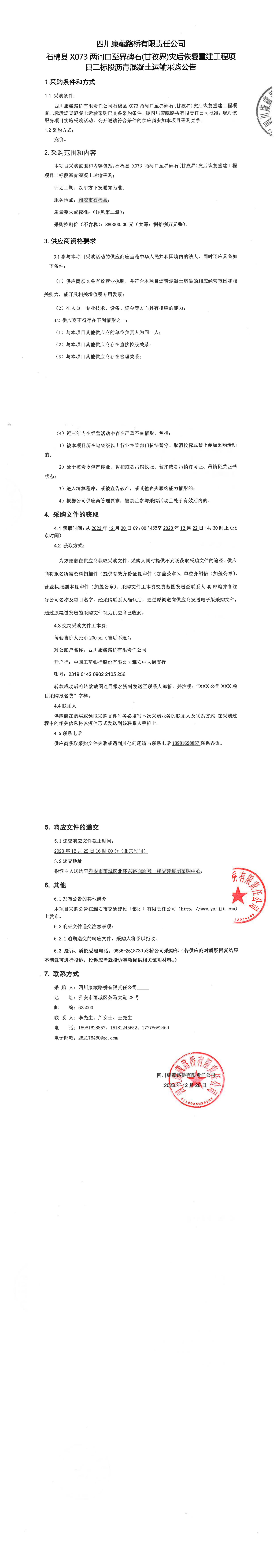 四川康藏路橋有限責任公司石棉縣X073兩河口至界碑石(甘孜界)災后恢復重建工程項目二標段瀝青混凝土運輸采購公告