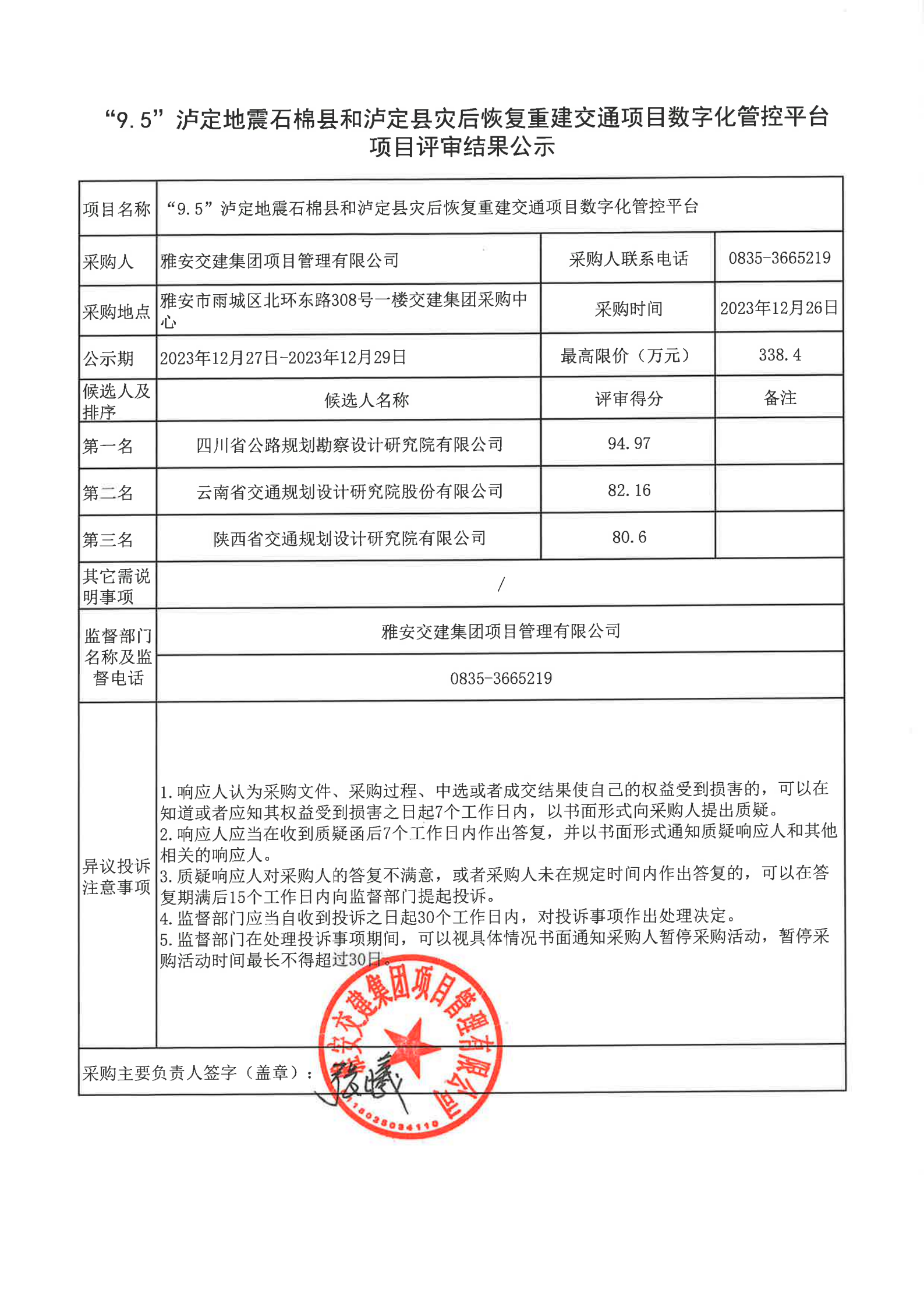 雅安交建集團(tuán)項(xiàng)目管理有限公司“9.5”瀘定地震石棉縣和瀘定縣災(zāi)后恢復(fù)重建交通項(xiàng)目數(shù)字化管控平臺(tái)項(xiàng)目評(píng)審結(jié)果公示