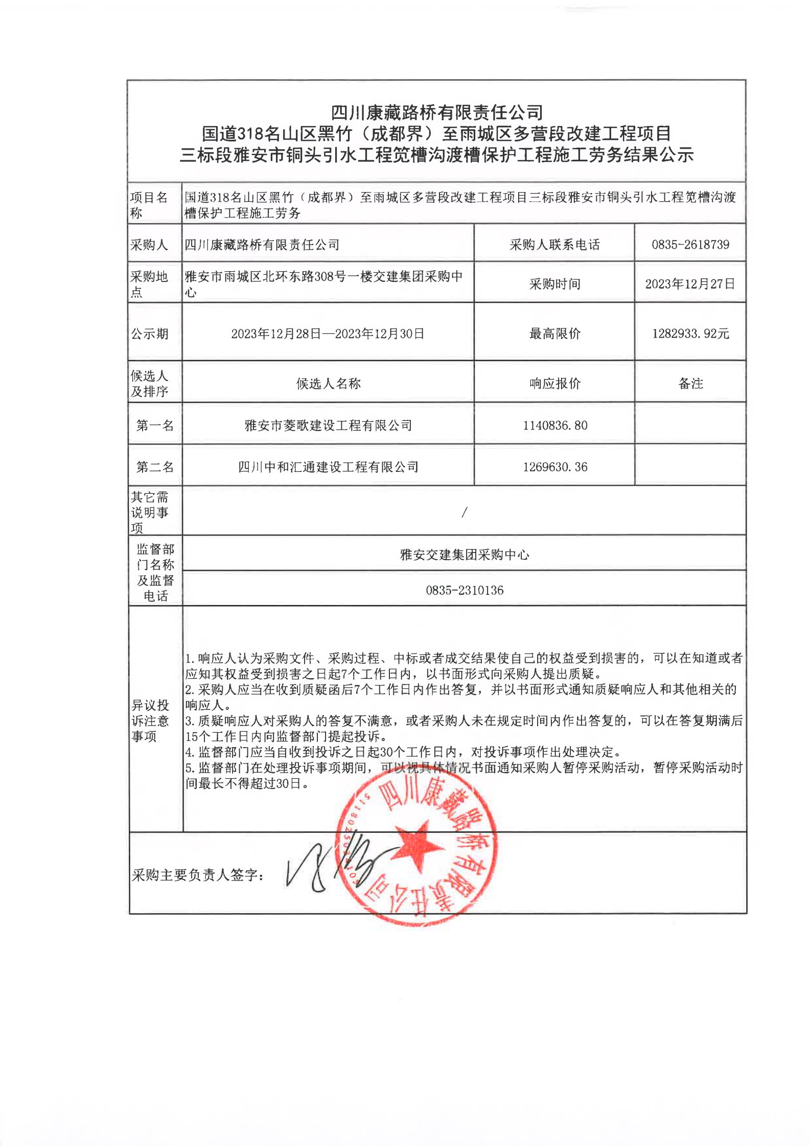 四川康藏路橋有限責任公司國道318名山區(qū)黑竹(成都界)至雨城區(qū)多營段改建工程項目三標段雅安市銅頭引水工程筧槽溝渡槽保護工程施工勞務(wù)結(jié)果公示