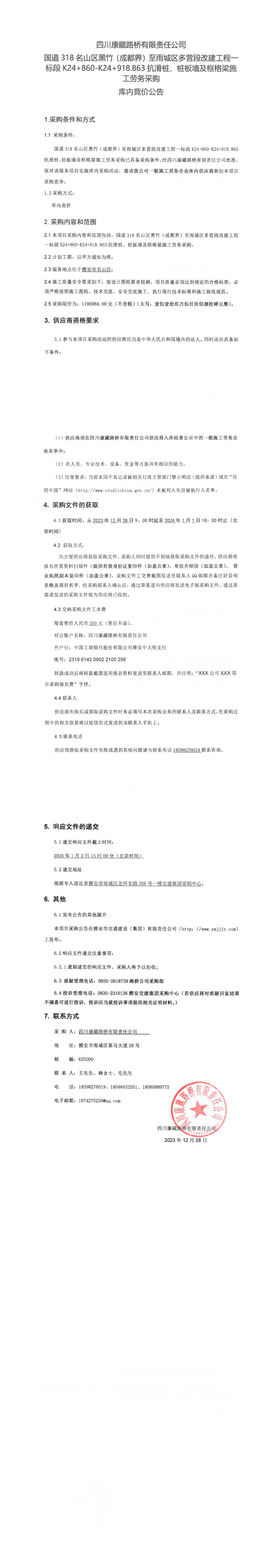 四川康藏路橋有限責(zé)任公司國道318名山區(qū)黑竹(成都界)至雨城區(qū)多營段改建工程一標(biāo)段K24+860-K24+918.863抗滑樁、樁板墻及框格梁施工勞務(wù)采購庫內(nèi)競價(jià)公告