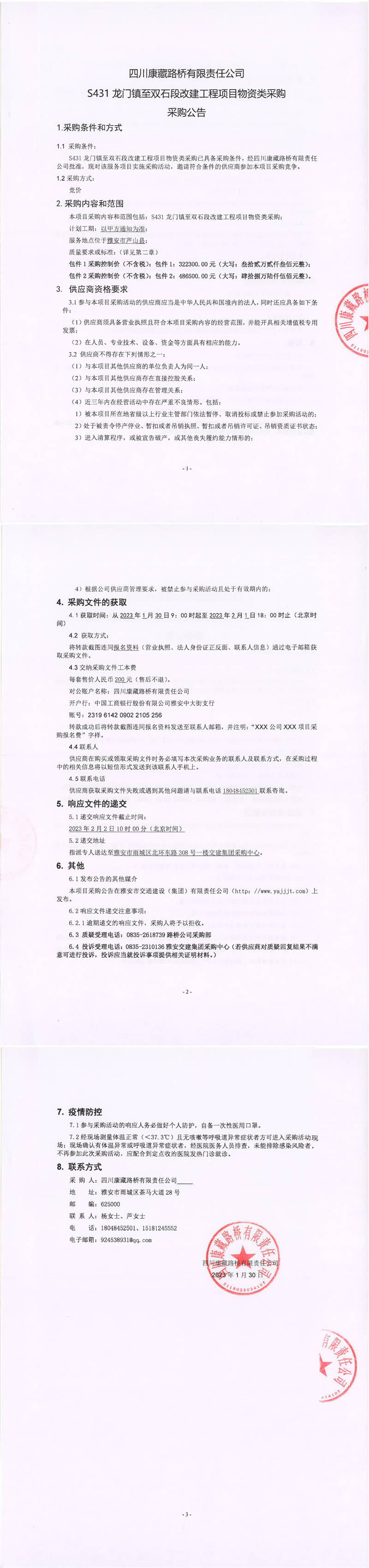 四川康藏路橋有限責(zé)任公司S431龍門鎮(zhèn)至雙石段改建工程項(xiàng)目物資類采購采購公告