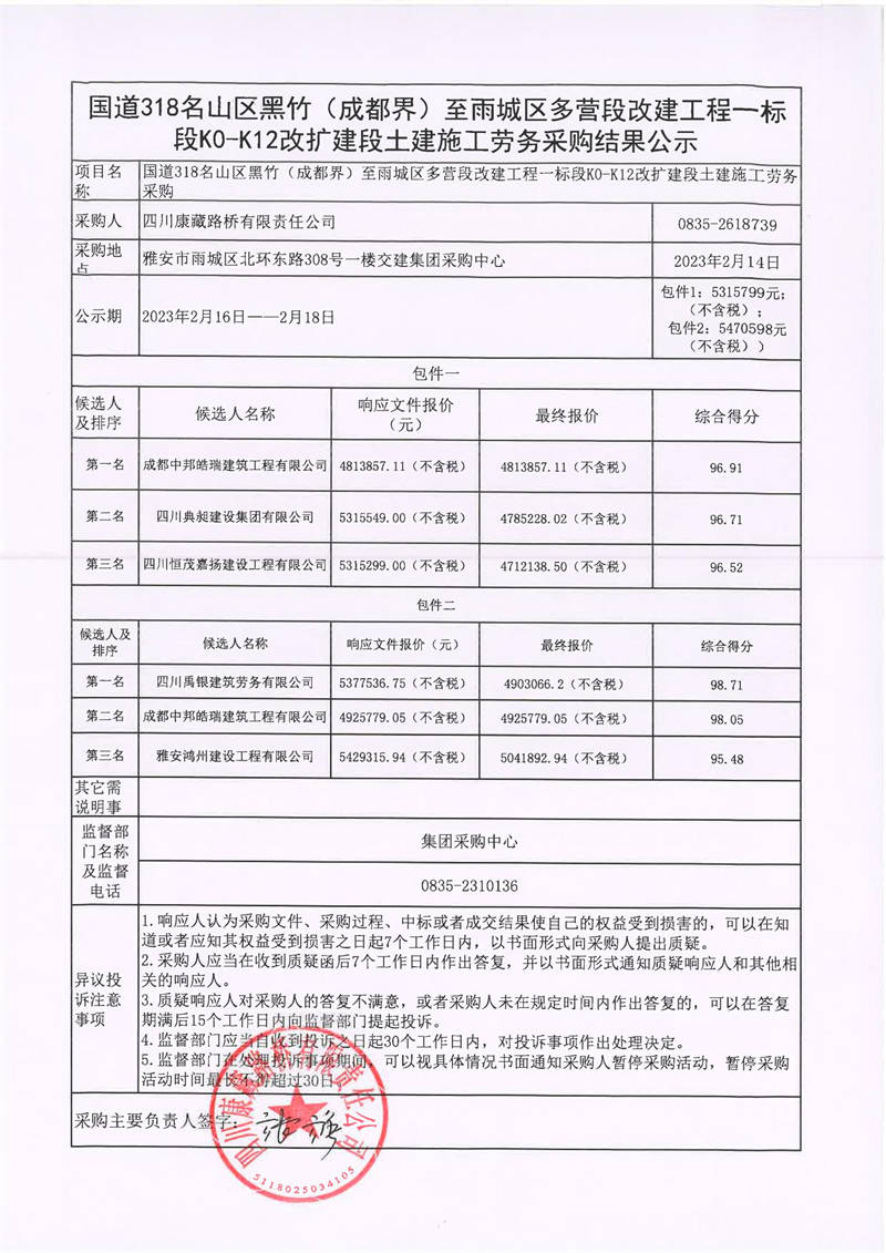四川康藏路橋有限責(zé)任公司國道318名山區(qū)黑竹(成都界)至雨城區(qū)多營段改建工程一標(biāo)段K0-K12改擴建段土建施工勞務(wù)采購結(jié)果公示