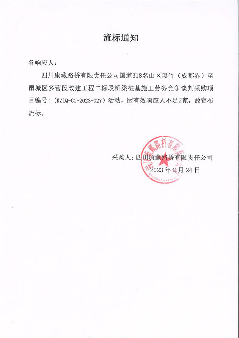 四川康藏路橋有限責(zé)任公司國道318名山區(qū)黑竹(成都界)至雨城區(qū)多營段改建工程二標段橋梁樁基施工勞務(wù)競爭談判采購流標通知