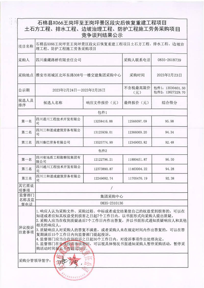 四川康藏路橋有限責(zé)任公司石棉縣X066王崗坪至王崗坪景區(qū)段災(zāi)后恢復(fù)重建工程項(xiàng)目土石方工程、排水工程、邊坡治理工程、防護(hù)工程施工勞務(wù)采購項(xiàng)目競(jìng)爭(zhēng)談判結(jié)果公示
