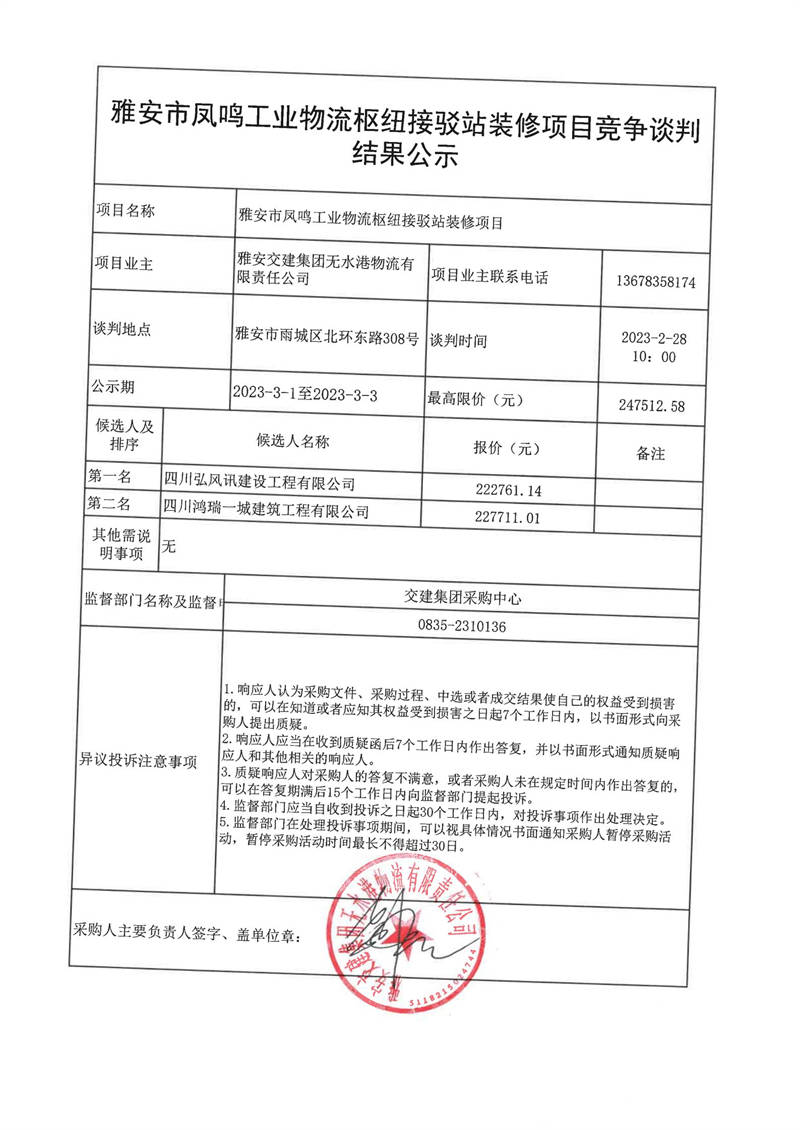 雅安交建集團(tuán)無(wú)水港物流有限責(zé)任公司雅安市鳳鳴工業(yè)物流樞紐接駁站裝修項(xiàng)目競(jìng)爭(zhēng)談判結(jié)果公示