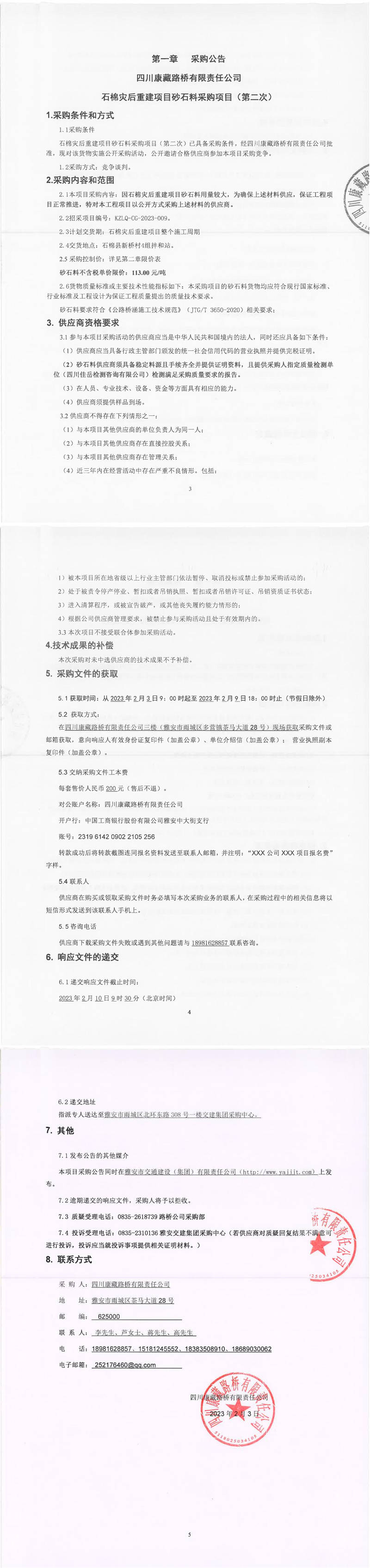 四川康藏路橋有限責(zé)任公司石棉災(zāi)后重建項(xiàng)目砂石料采購(gòu)項(xiàng)目(第二次)采購(gòu)公告