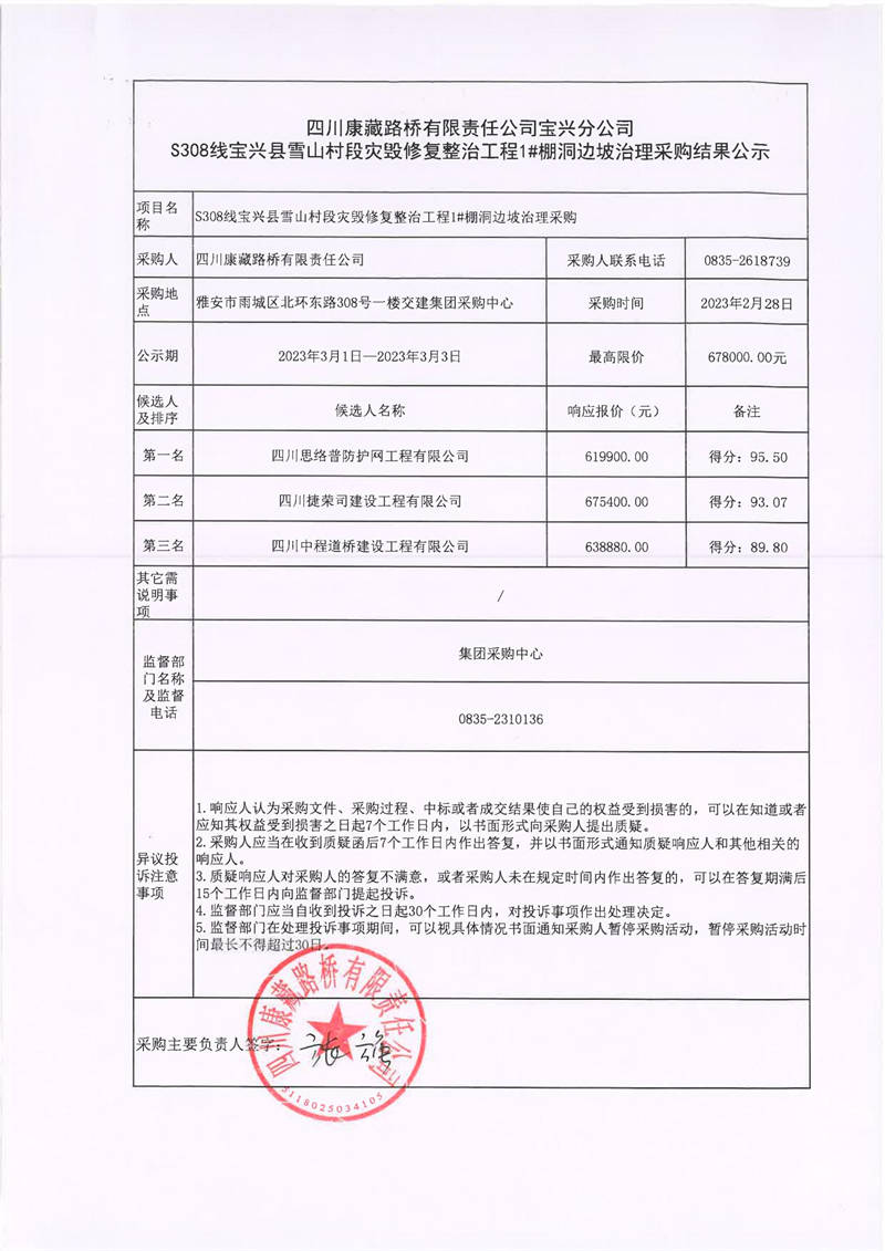 四川康藏路橋有限責(zé)任公司寶興分公司S308線寶興縣雪山村段災(zāi)毀修復(fù)整治工程1#棚洞邊坡治理采購(gòu)結(jié)果公示