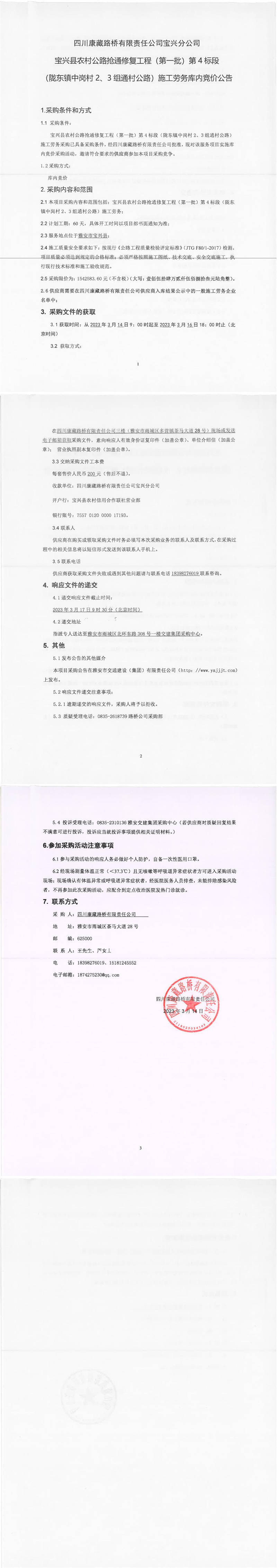 四川康藏路橋有限責任公司寶興分公司寶興縣農(nóng)村公路搶通修復(fù)工程(第一批)第4標段(隴東鎮(zhèn)中崗村2、3組通村公路)施工勞務(wù)庫內(nèi)競價公告