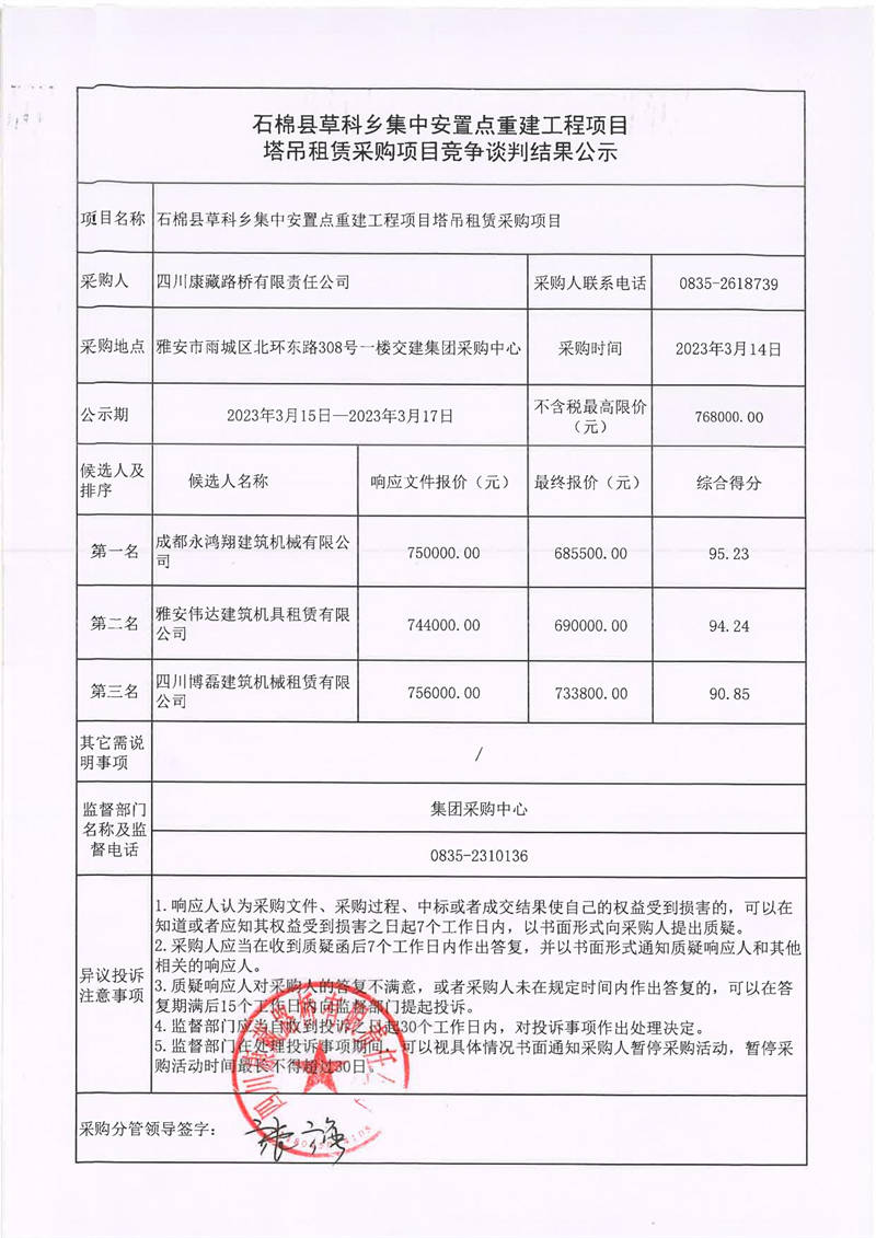 四川康藏路橋有限責(zé)任公司石棉草科鄉(xiāng)集中安置點(diǎn)重建工程項(xiàng)目塔吊租賃采購(gòu)競(jìng)爭(zhēng)談判結(jié)果公示
