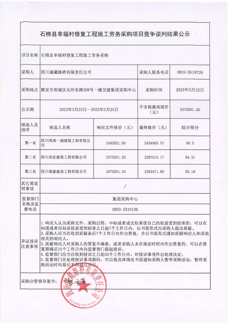 四川康藏路橋有限責(zé)任公司石棉縣幸福村修復(fù)工程施工勞務(wù)采購項目競爭談判結(jié)果公示
