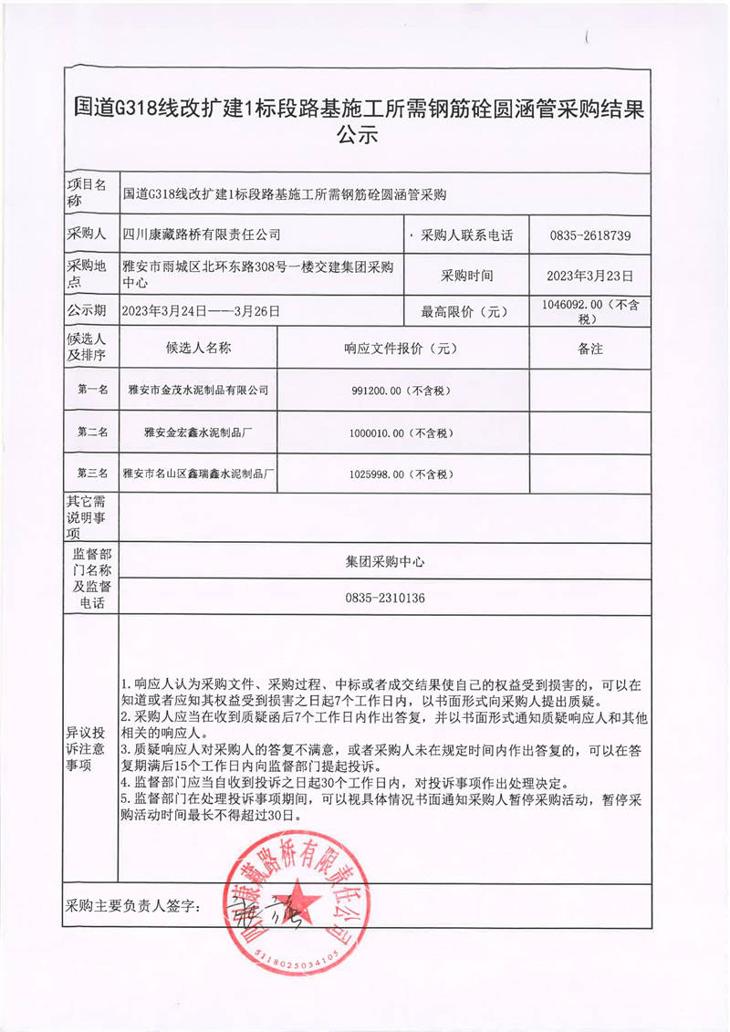 四川康藏路橋有限責(zé)任公司石國(guó)道G318擴(kuò)建1標(biāo)段路基施工所需鋼筋砼圓涵管采購(gòu)結(jié)果公示