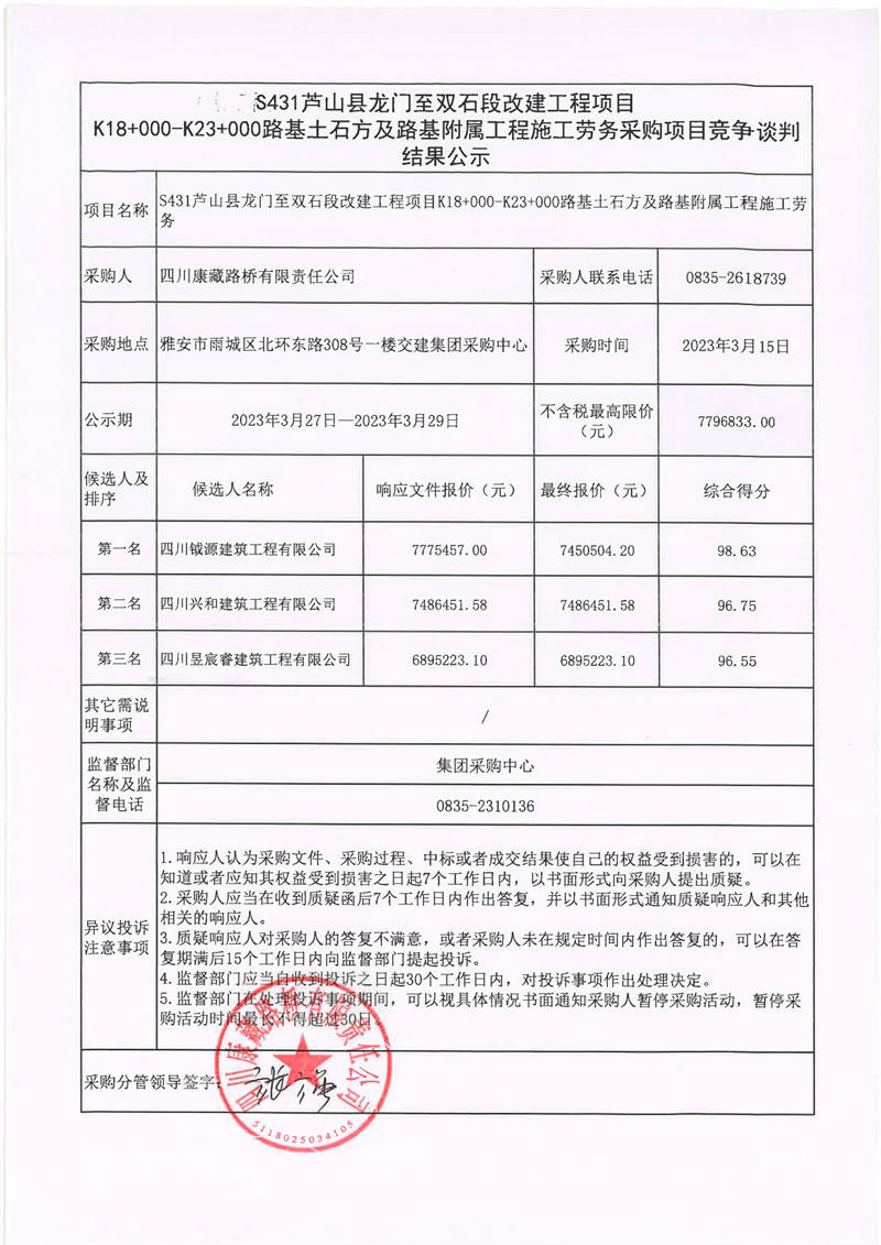 四川康藏路橋有限責(zé)任公司S431蘆山縣龍門至雙石段改建工程項目K18+000-K23+000路路基附屬工程施工勞務(wù)采購項目競爭談判結(jié)果公示
