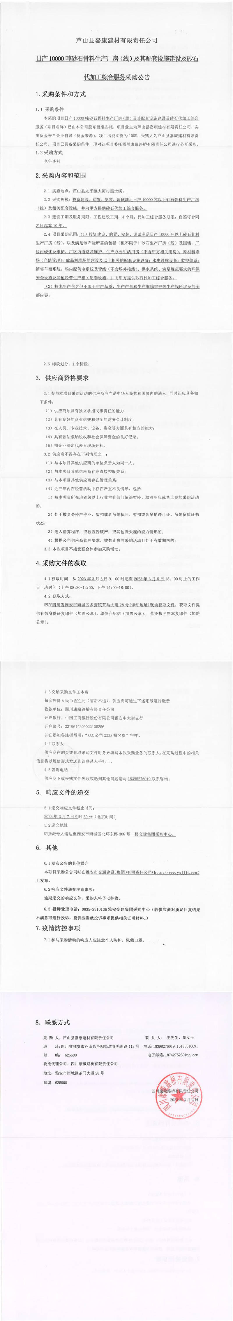 蘆山縣嘉康嘉康建材有限責任公司日產(chǎn)10000噸砂石骨料生產(chǎn)廠房(線)及其配套設施建設及砂石代加工綜合服務采購公告