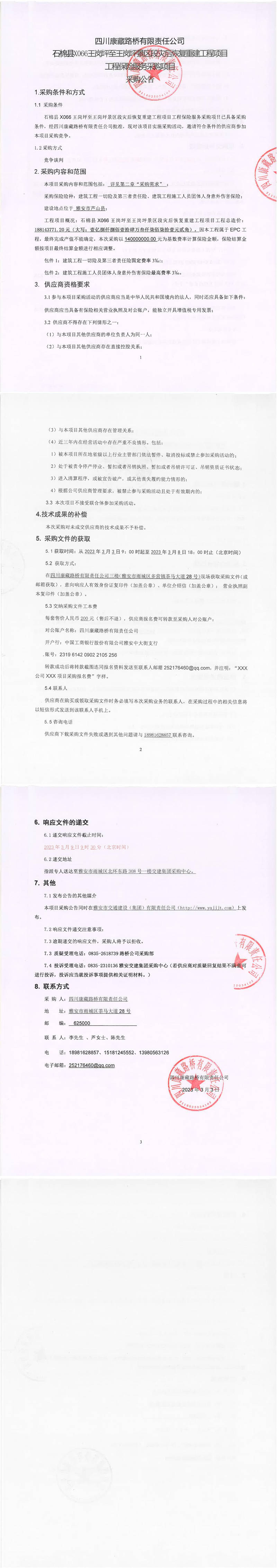 四川康藏路橋有限責任公司石棉縣X066王崗坪至王崗坪景區(qū)段災(zāi)后恢復(fù)重建工程項目工程保險服務(wù)采購公告