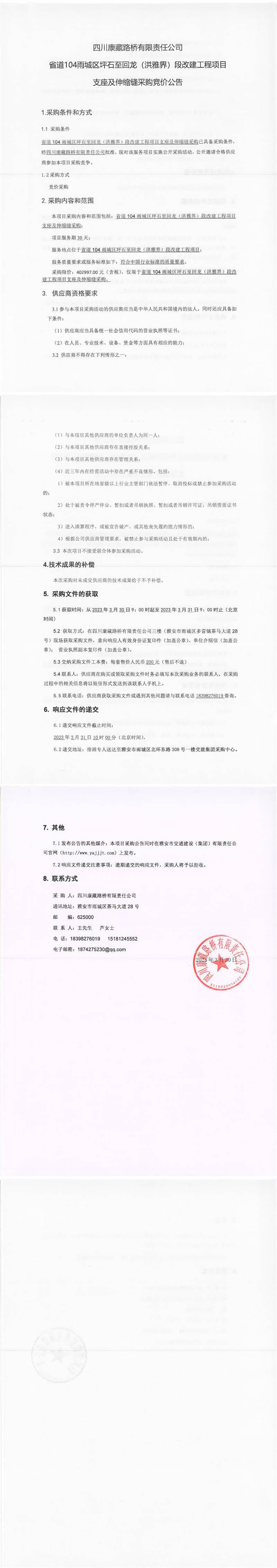 四川康藏路橋有限責(zé)任公司省道104雨城區(qū)坪石至回龍(洪雅界)段改建工程項(xiàng)目支座及伸縮縫采購競(jìng)價(jià)公告
