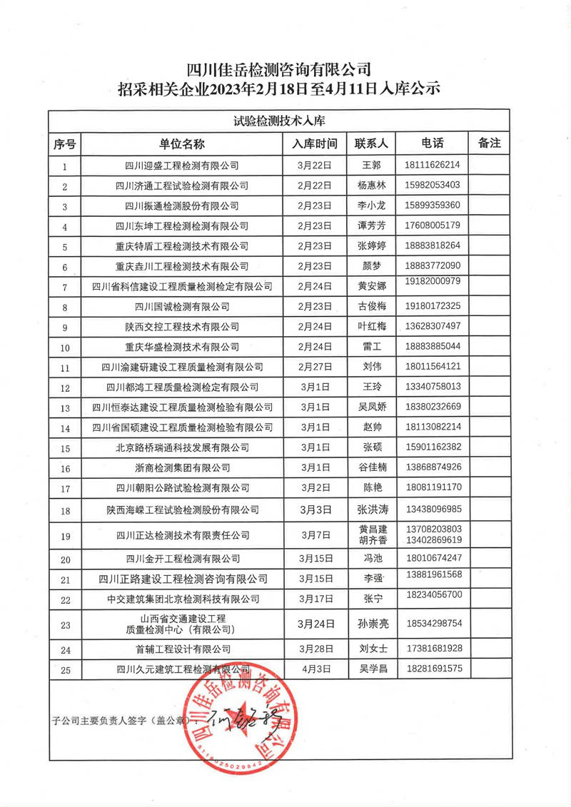 四川佳岳檢測咨詢有限公司(試驗(yàn)檢測勞務(wù)供應(yīng)商庫)2023年2月18日至4月11日入庫結(jié)果公示