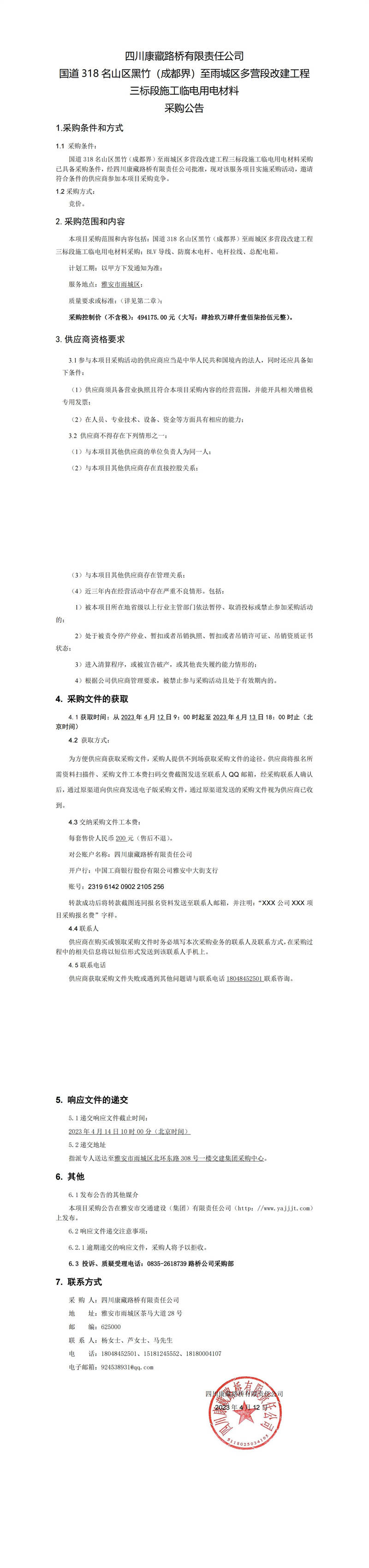 四川康藏路橋有限責任公司國道318名山區(qū)黑竹(成都界)至雨城區(qū)多營段改建工程三標段施工臨電用電材料采購公告