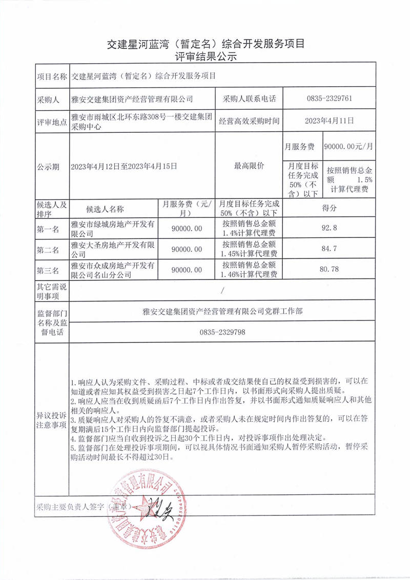 雅安交建集團(tuán)資產(chǎn)經(jīng)營(yíng)管理有限公司交建星河藍(lán)灣(暫定名)綜合開發(fā)服務(wù)項(xiàng)目評(píng)審結(jié)果公示