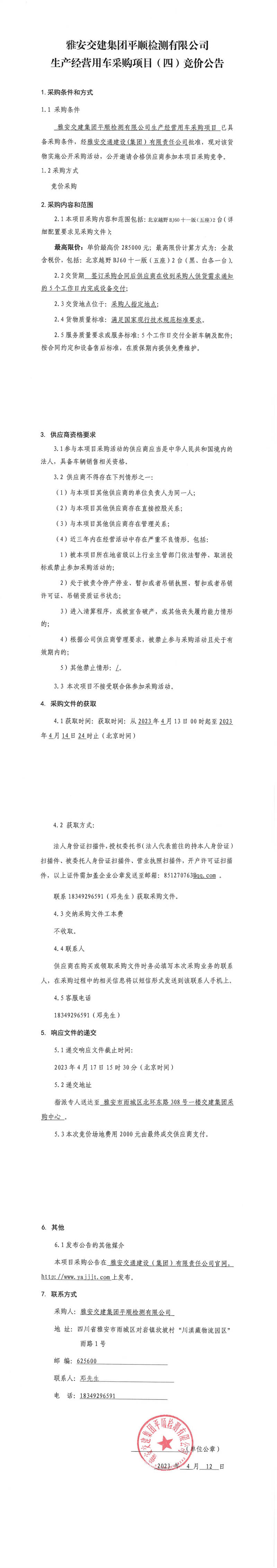 雅安交建集團(tuán)平順檢測有限公司平順公司生產(chǎn)經(jīng)營用車采購項(xiàng)目(四)競價(jià)公告