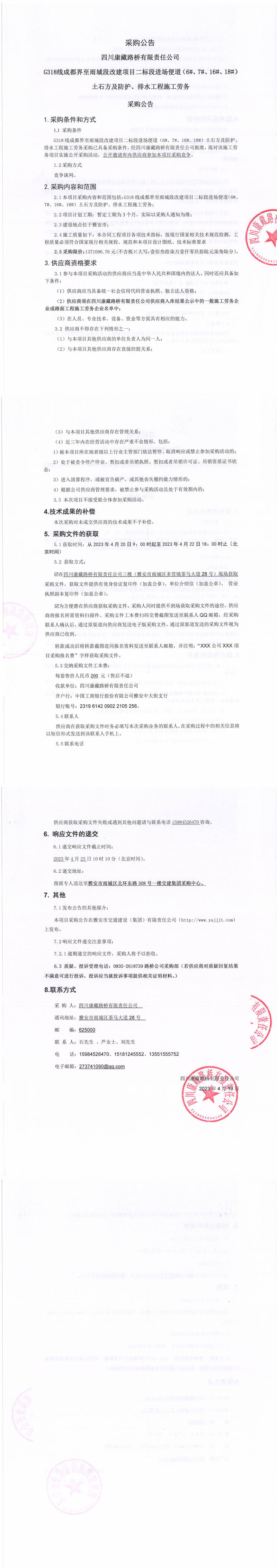 四川康藏路橋有限責(zé)任公司G318線(xiàn)成都至雨城段改建項(xiàng)目二標(biāo)段進(jìn)場(chǎng)便道(6#、7#、16#、18#)土石方及防護(hù)、排水工程施工勞務(wù)