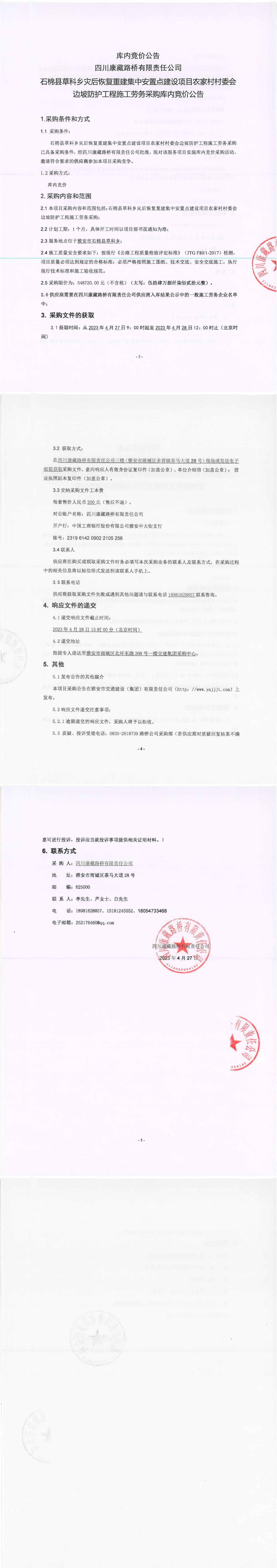四川康藏路橋有限責(zé)任公司石棉草科鄉(xiāng)災(zāi)后恢復(fù)重建集中安置點(diǎn)建設(shè)項(xiàng)目農(nóng)家村村委會邊坡防護(hù)工程施工勞務(wù)采購采購庫內(nèi)競價(jià)公告