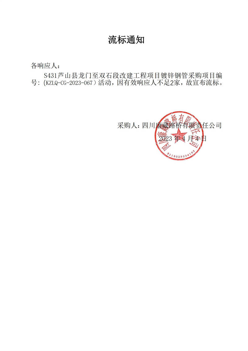 四川康藏路橋有限責(zé)任公司S431蘆山縣龍門(mén)至雙石段改建工程項(xiàng)目鍍鋅鋼管采購(gòu)流標(biāo)通知