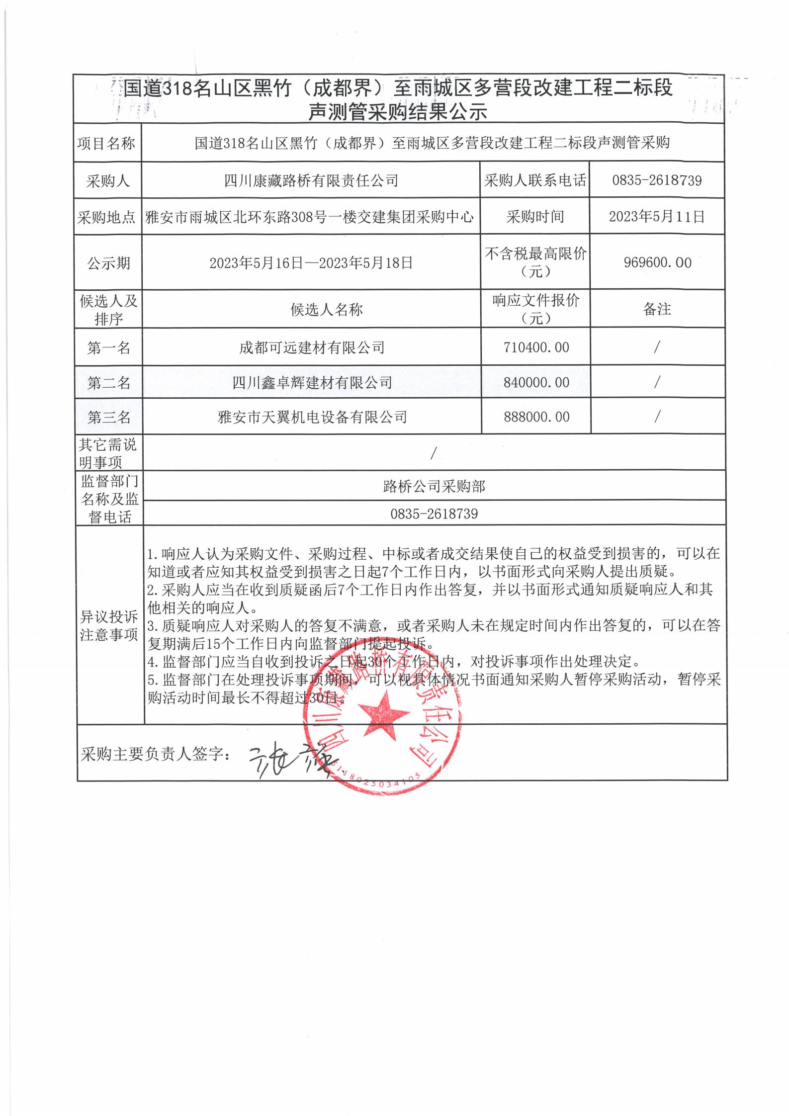 四川康藏路橋有限責任公司國道318名山區(qū)黑竹(成都界)至雨城區(qū)多營段改建工程二標段聲測管采購結果公示