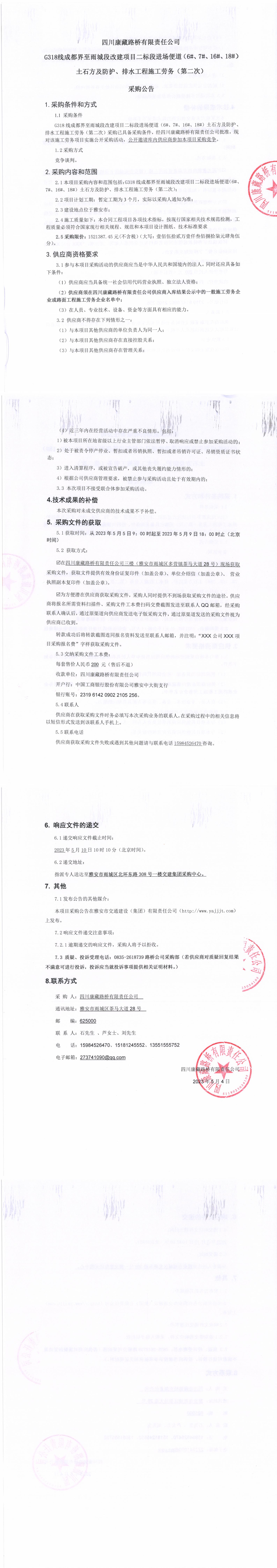 四川康藏路橋有限責(zé)任公司G318線成都至雨城段改建項(xiàng)目二標(biāo)段進(jìn)場(chǎng)便道(6#、7#、16#、18#)土石方及防護(hù)、排水工程施工勞務(wù)(第二次)采購公告