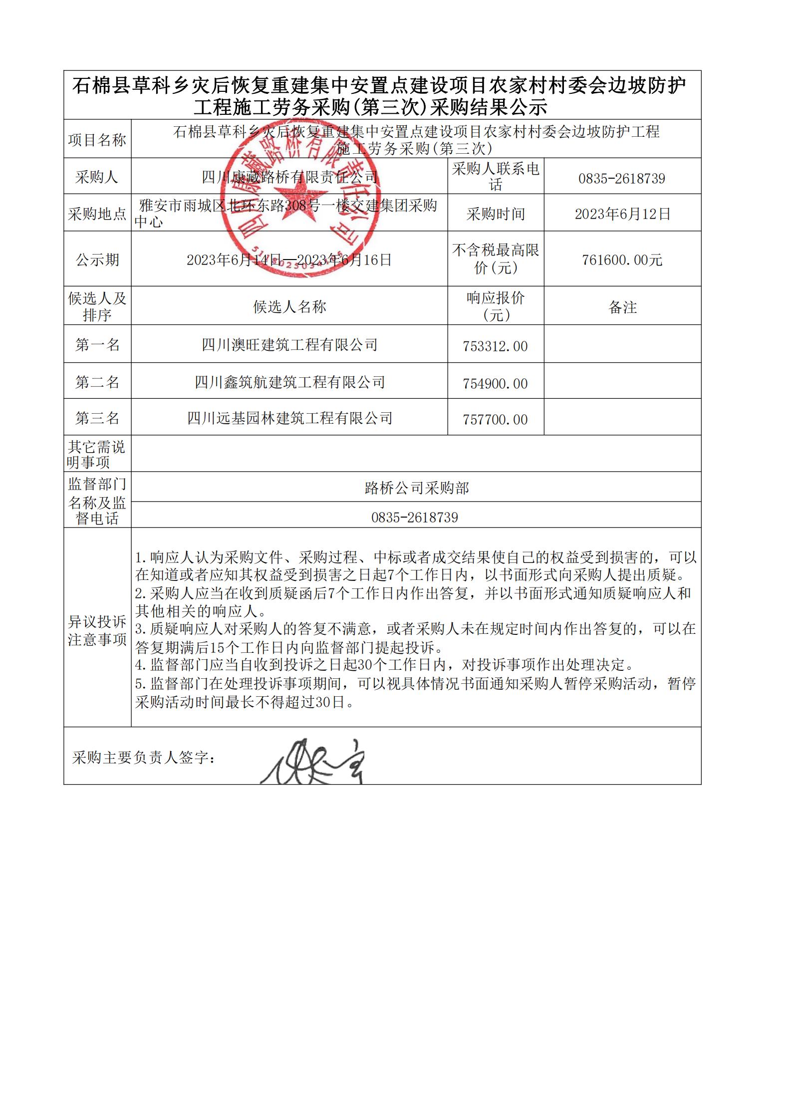 四川康藏路橋有限責(zé)任公司石棉縣草科鄉(xiāng)災(zāi)后恢復(fù)重建集中安置點(diǎn)建設(shè)項(xiàng)目農(nóng)家村村委會(huì)邊坡防護(hù)工程施工勞務(wù)采購(gòu)(第三次)結(jié)果公示