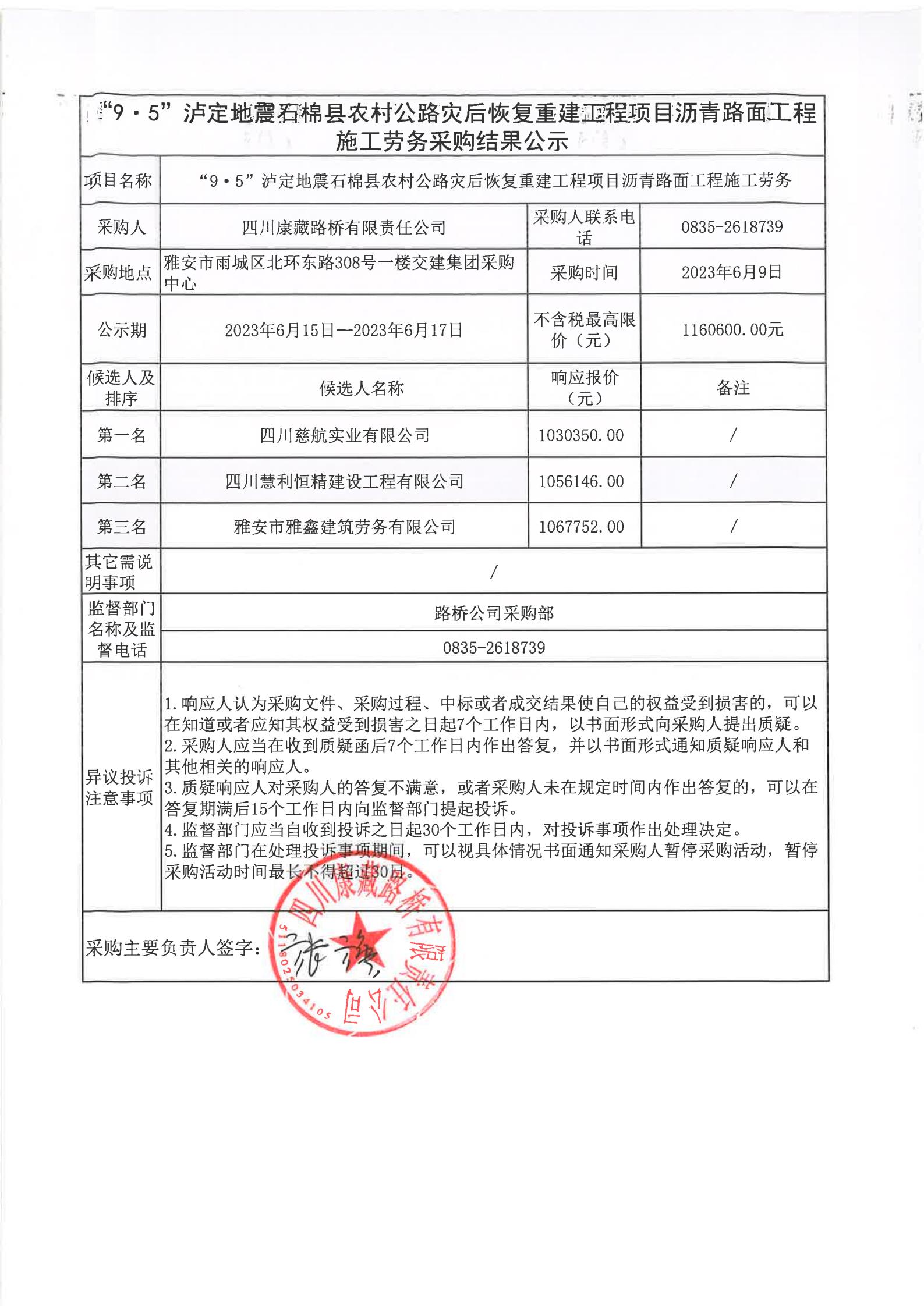 四川康藏路橋有限責任公司“9·5”瀘定地震石棉縣農(nóng)村公路災后恢復重建工程項目瀝青路面工程施工勞務采購結(jié)果公示