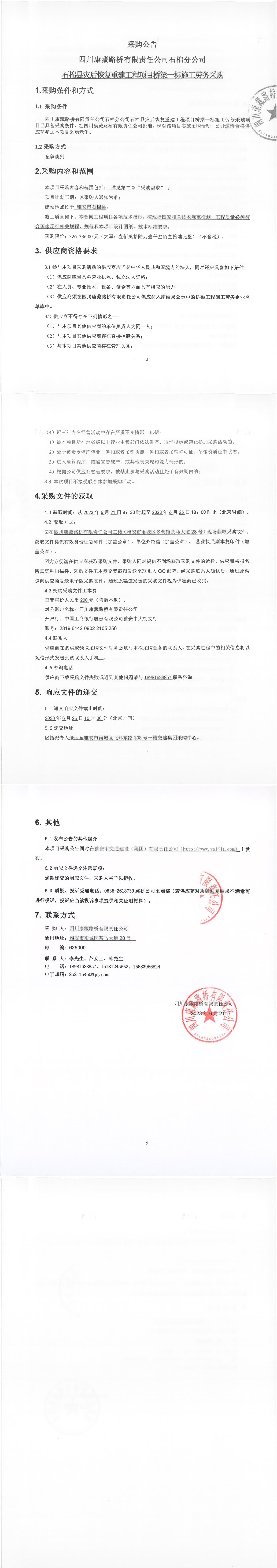 四川康藏路橋有限責(zé)任公司石棉分公司石棉縣災(zāi)后恢復(fù)重建工程項(xiàng)目橋梁一標(biāo)段施工勞務(wù)采購(gòu)公告