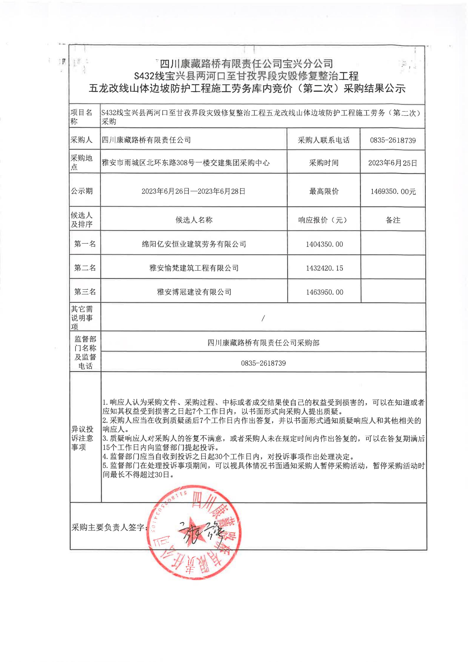 四川康藏路橋有限責任公司寶興分公司S432寶興縣兩河口至甘孜界段災毀修復整治工程五龍改線山體邊坡防護工程施工勞務(wù)庫內(nèi)競價(第二次)結(jié)果公示