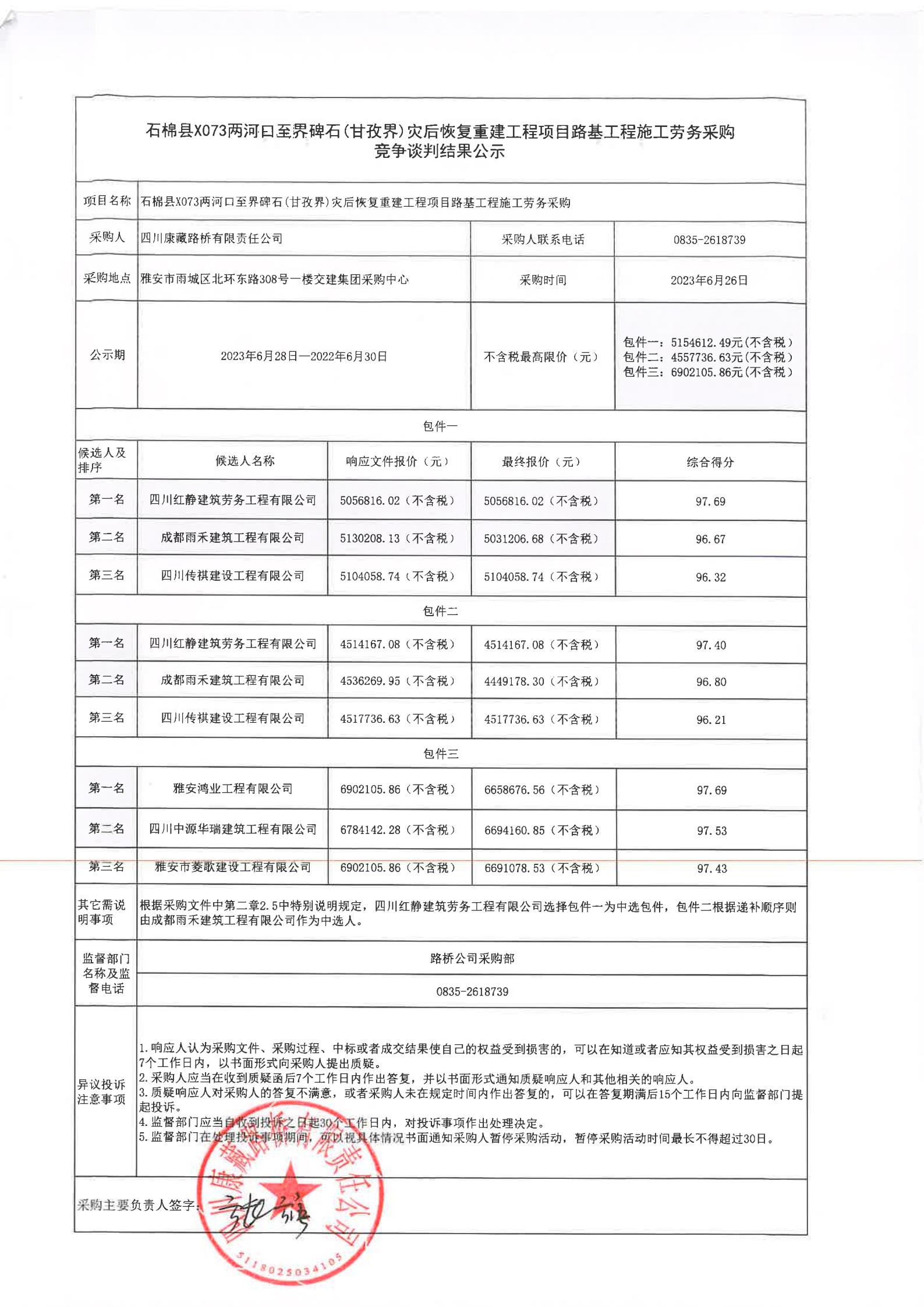 四川康藏路橋有限責(zé)任公司石棉縣X073兩河口至界碑石(甘孜界)災(zāi)后恢復(fù)重建工程項目路基工程施工勞務(wù)采購競爭談判結(jié)果公示