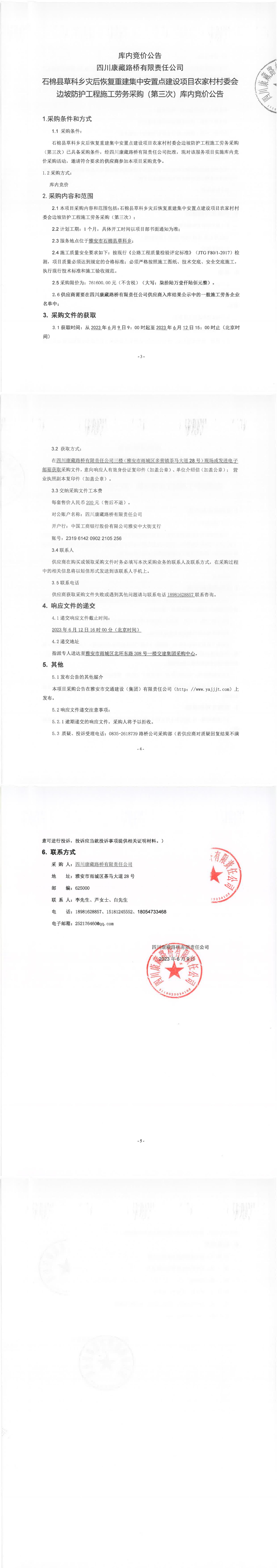 四川康藏路橋有限責任公司石棉縣草科鄉(xiāng)災后恢復重建集中安置點建設項目農(nóng)家村村委會邊坡防護工程施工勞務采購(第三次)庫內競價公告