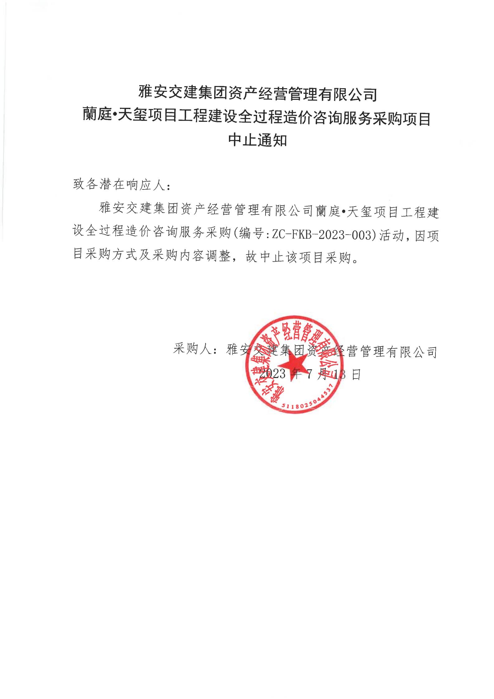 雅安交建集團資產(chǎn)經(jīng)營管理有限公司蘭庭·天璽項目工程建設(shè)全過程造價咨詢服務(wù)采購項目中止通知