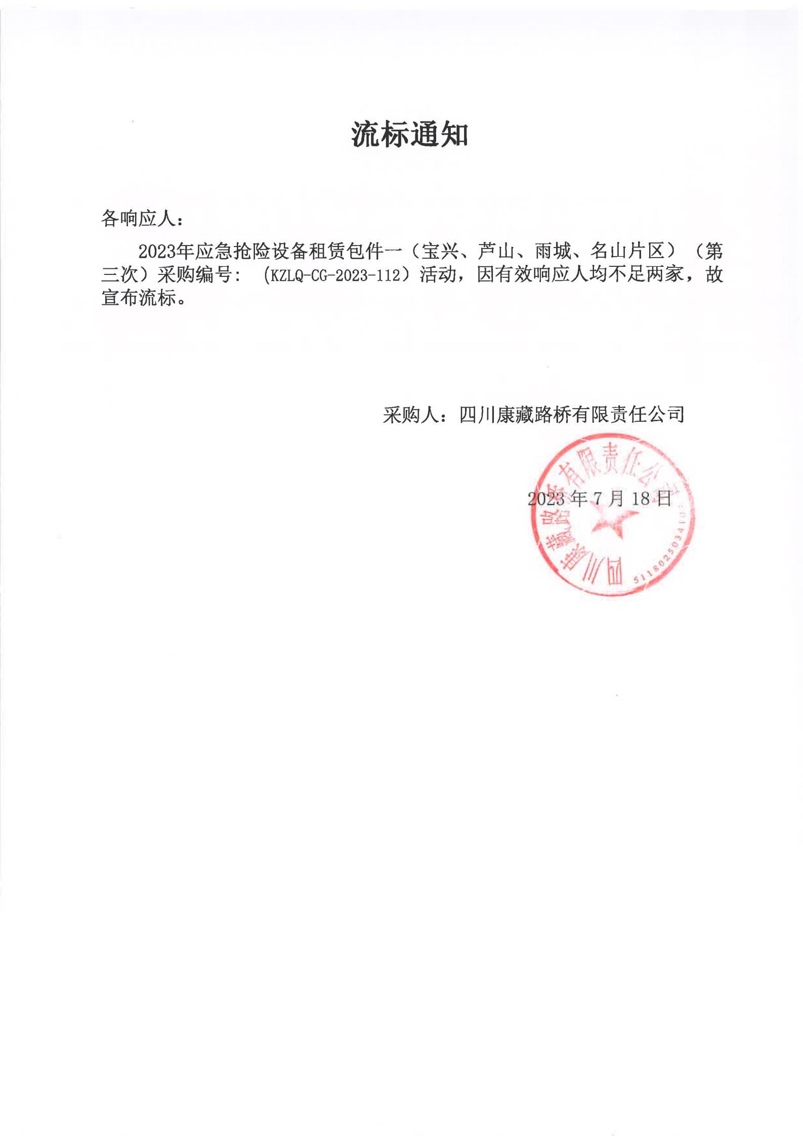 四川康藏路橋有限責任公司2023年應急搶險設備租賃包件一(寶興、蘆山、雨城、名山片區(qū))(第三次)流標通知