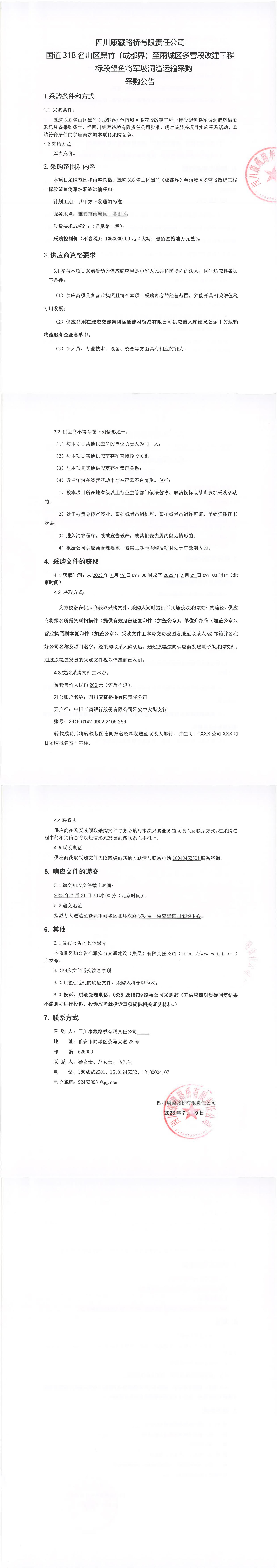 四川康藏路橋有限責(zé)任公司國(guó)道318名山區(qū)黑竹(成都界)至雨城區(qū)多營(yíng)段改建工程一標(biāo)段望魚將軍坡洞渣運(yùn)輸采購(gòu)公告