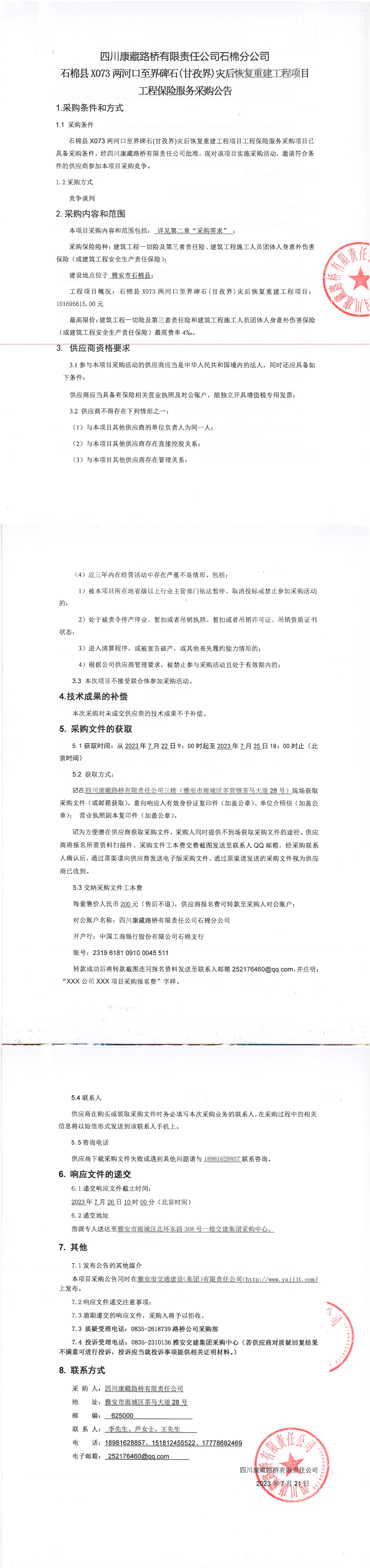 四川康藏路橋有限責(zé)任公司石棉縣X073兩河口至界碑石(甘孜界)災(zāi)后恢復(fù)重建工程項(xiàng)目工程保險(xiǎn)服務(wù)采購公告