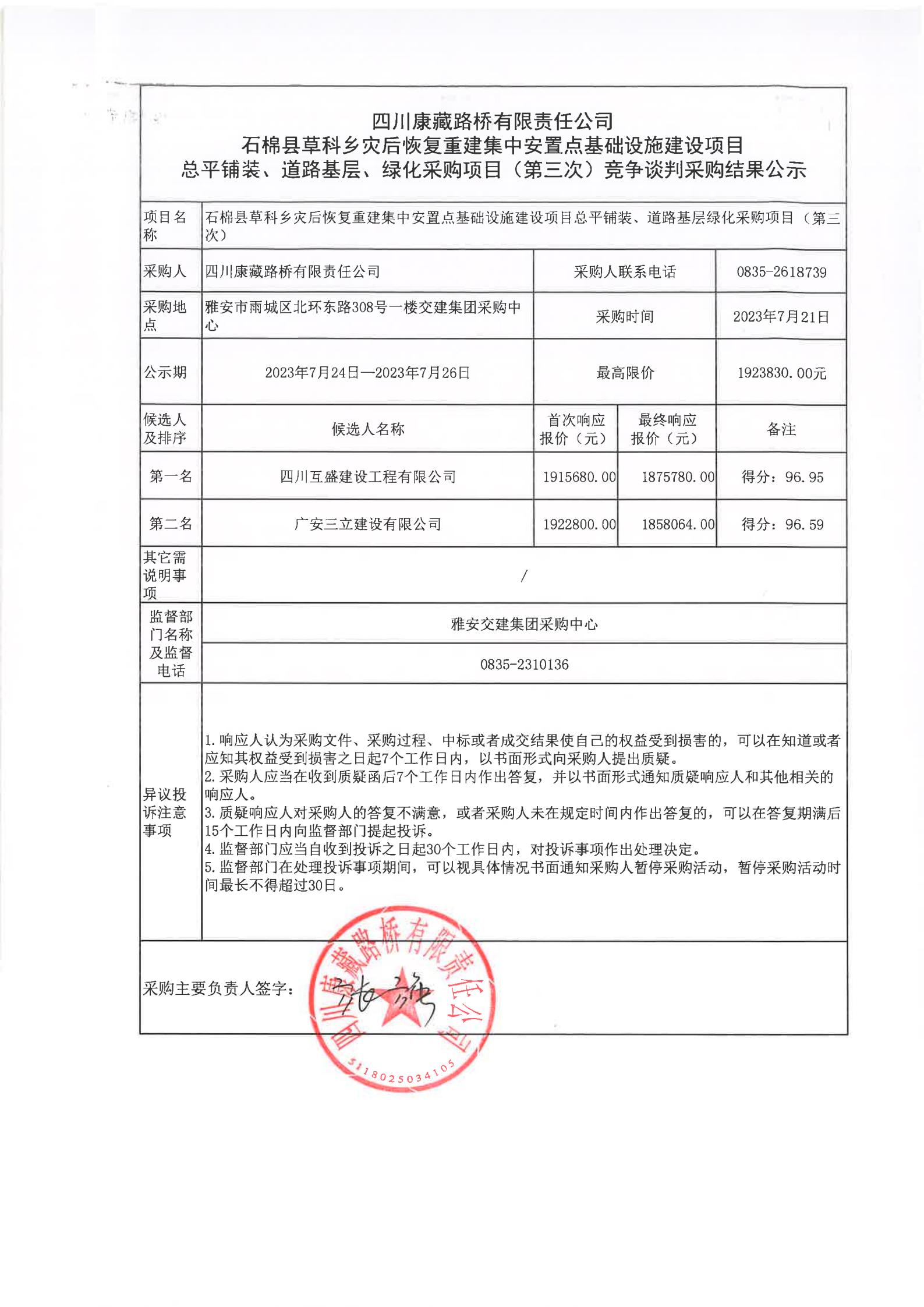 四川康藏路橋有限責(zé)任公司石棉縣草科鄉(xiāng)災(zāi)后恢復(fù)重建集中安置點(diǎn)基礎(chǔ)設(shè)施建設(shè)項(xiàng)目總平鋪裝、道路基層、綠化采購(gòu)項(xiàng)目(第三次)競(jìng)爭(zhēng)談判采購(gòu)結(jié)果公示