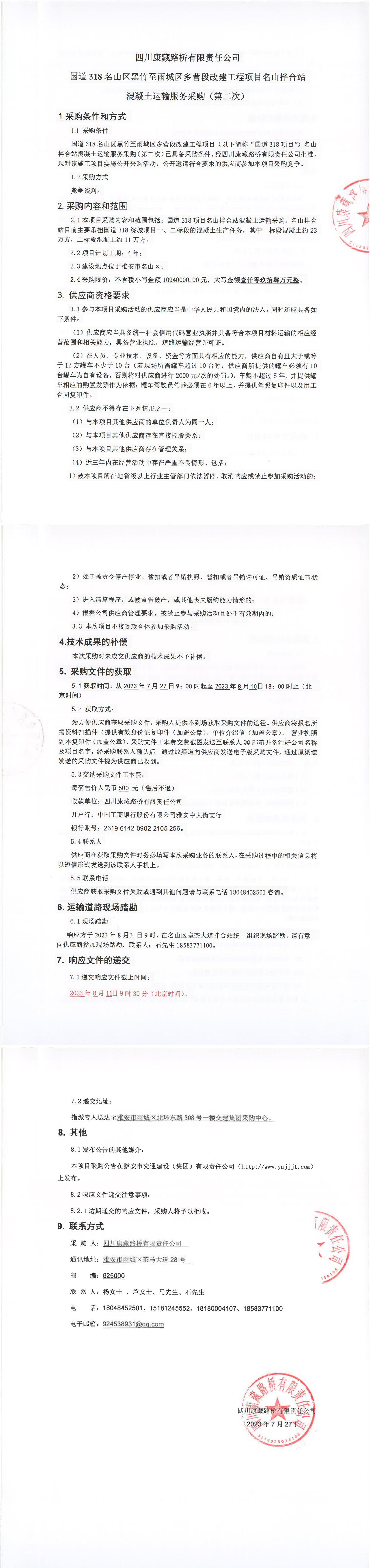 四川康藏路橋有限責(zé)任公司國道318名山區(qū)黑竹至雨城區(qū)多營段改建工程項目名山拌合站混凝土運輸服務(wù)采購(第二次)
