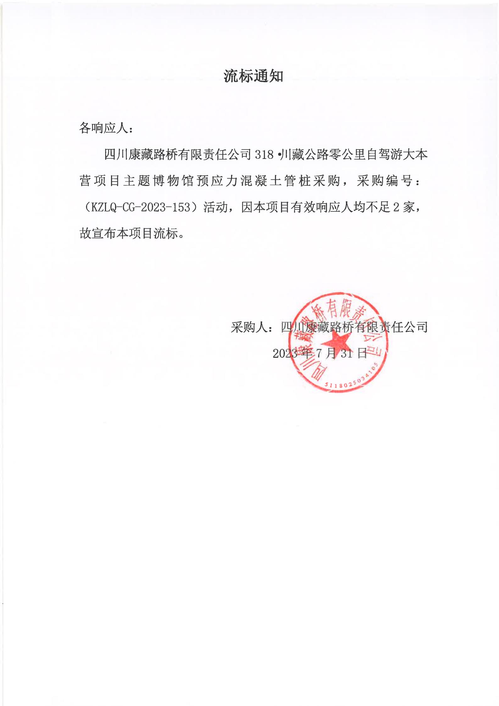 四川康藏路橋有限責任公司318·川藏公路零公里自駕游大本營項目主題博物館預應力混凝土管樁采購流標通知