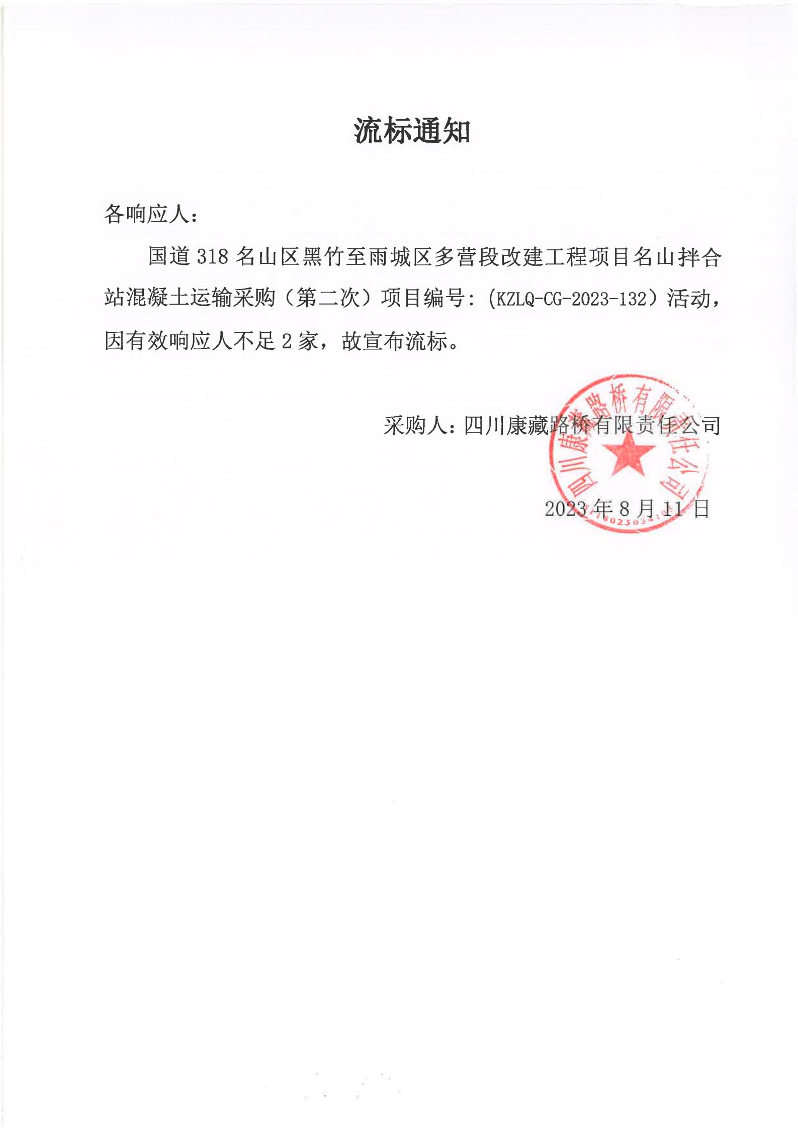 四川康藏路橋有限責(zé)任公司國道318名山區(qū)黑竹至雨城區(qū)多營段改建工程項目名山拌合站混凝土運輸服務(wù)(第二次)流標通知)