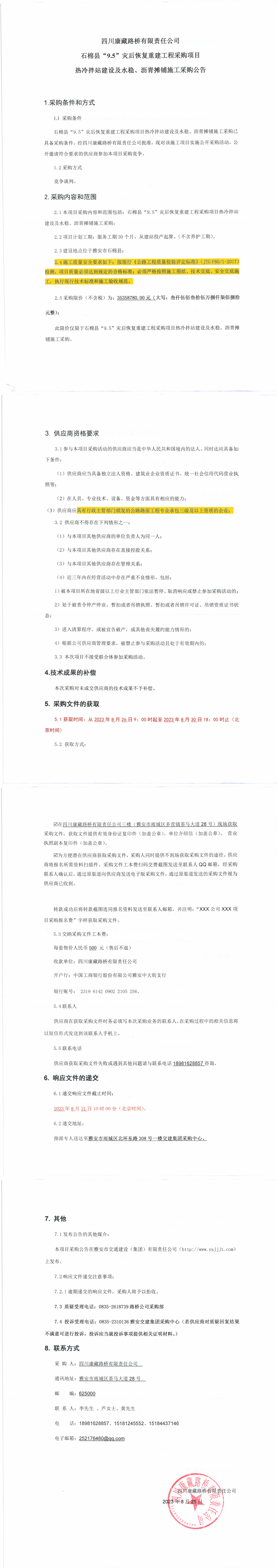 四川康藏路橋有限責(zé)任公司石棉縣“9.5”災(zāi)后恢復(fù)重建工程采購項(xiàng)目熱冷拌站建設(shè)及水穩(wěn)、瀝青攤鋪施工采購公告
