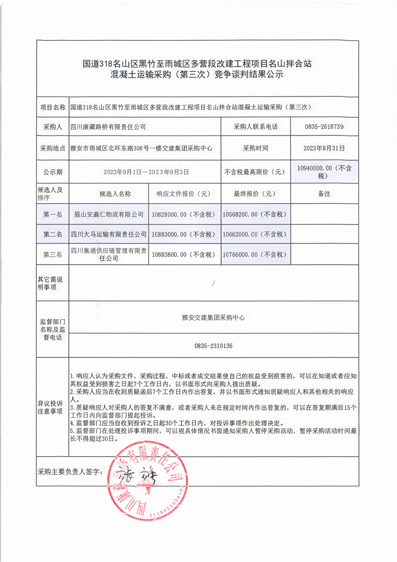 四川康藏路橋有限責(zé)任公司國(guó)道318名山區(qū)黑竹至至雨城區(qū)多營(yíng)段改建工程項(xiàng)目名山拌合站混凝土運(yùn)輸采購(gòu)(第三次)競(jìng)爭(zhēng)談判結(jié)果公示