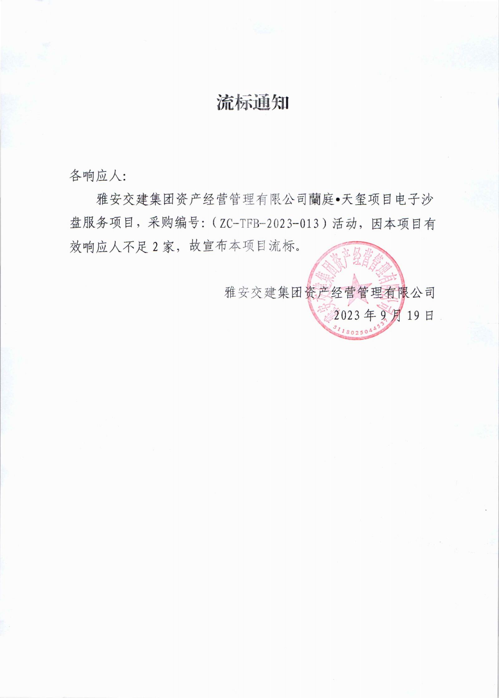 雅安交建集團(tuán)資產(chǎn)經(jīng)營管理有限公司蘭庭•天璽項目電子沙盤服務(wù)項目流標(biāo)通知書